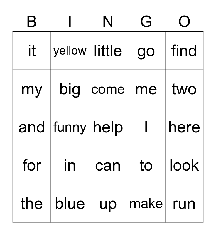 This bingo card has 40 words: a, and, away, big, blue, can, come, down, find, for, funny, go, help, here, I, in, is, it, jump, little, look, make, me, my, not, one, play, red, run, said, see, the, three, to, two, up, we, where, yellow and you.