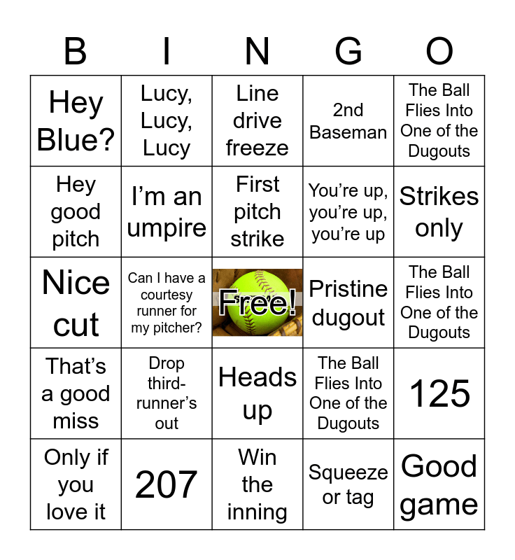 This bingo card has a free space and 28 words: 125, Box! Box!, You’re up, you’re up, you’re up, Squeeze or tag, Hey good pitch, Line drive freeze, Lucy, Lucy, Lucy, That’s a good miss, Pristine dugout, Only if you love it, Nice cut, 2nd Baseman, 207, Win the inning, Strikes only, Let’s glove ‘em, Drop third- runner’s out, I’m an umpire, First pitch strike, Heads up, Hey Blue?, Slide!, Good game, Can I have a courtesy runner for my pitcher?, The Ball Flies Into One of the Dugouts, The Ball Flies Into One of the Dugouts, The Ball Flies Into One of the Dugouts and The Ball Flies Into One of the Dugouts.