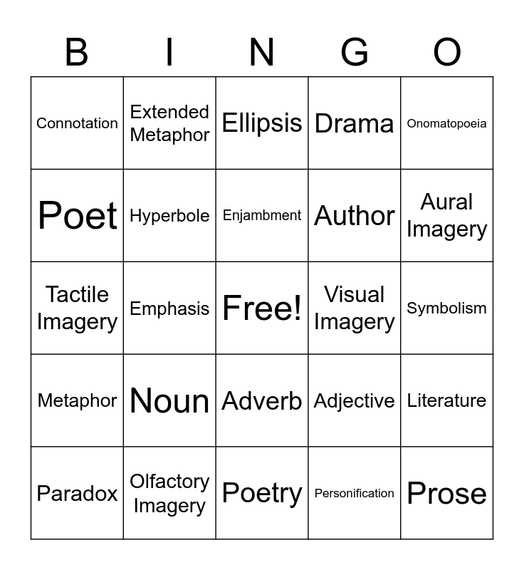 This bingo card has a free space and 34 words: Oxymoron, Personification, Repetition, Simile, Metaphor, Hyperbole, Onomatopoeia, Paradox, Extended Metaphor, Motif, Enjambment, Ellipsis, Conjunction, Modality, Visual Imagery, Aural Imagery, Olfactory Imagery, Tactile Imagery, Noun, Adjective, Adverb, Verb, Connotation, Symbolism, Poetry, Prose, Drama, Playwright, Author, Poet, Grammar, Emphasis, Literature and Punctuation.