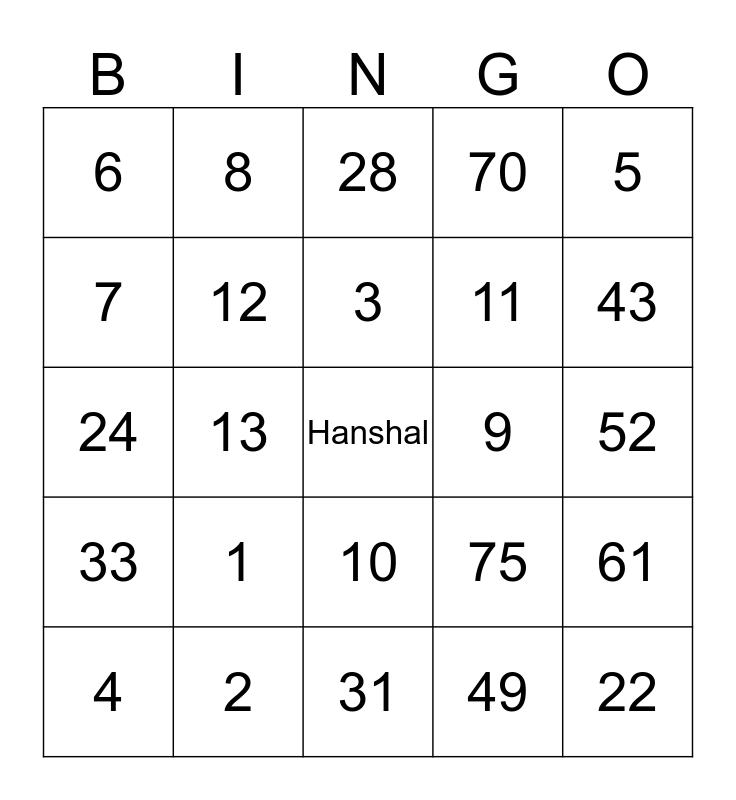 This bingo card has a free space and 24 words: 1, 2, 3, 4, 5, 6, 7, 8, 9, 10, 11, 24, 75, 61, 12, 49, 52, 28, 43, 13, 22, 33, 70 and 31.