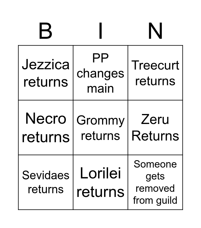 This bingo card has 17 words: TMap returns, Kity returns, Treecurt returns, Jezzica returns, Free!, Necro returns, Belanor returns, Sevidaes returns, Lorilei returns, Zeru Returns, Wonty changes main/first char, Loperixi Returns, Grommy returns, PP changes main, Someone gets removed from guild, Yoolaza returns and Wilted Returns.