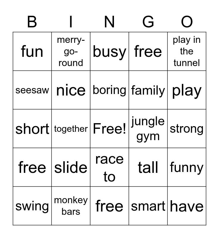 This bingo card has a free space and 24 words: slide, monkey bars, boring, swing, play in the tunnel, fun, seesaw, merry-go-round, jungle gym, race to, family, short, tall, funny, nice, smart, strong, busy, play, together, have, free, free and free.