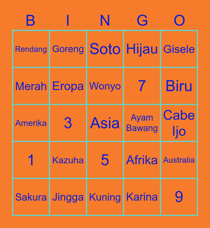 This bingo card has a free space and 24 words: Sakura, Kazuha, Wonyo, Karina, Gisele, Rendang, Goreng, Soto, Ayam Bawang, Cabe Ijo, Amerika, Eropa, Afrika, Australia, Merah, Jingga, Kuning, Hijau, Biru, 1, 3, 5, 7 and 9.