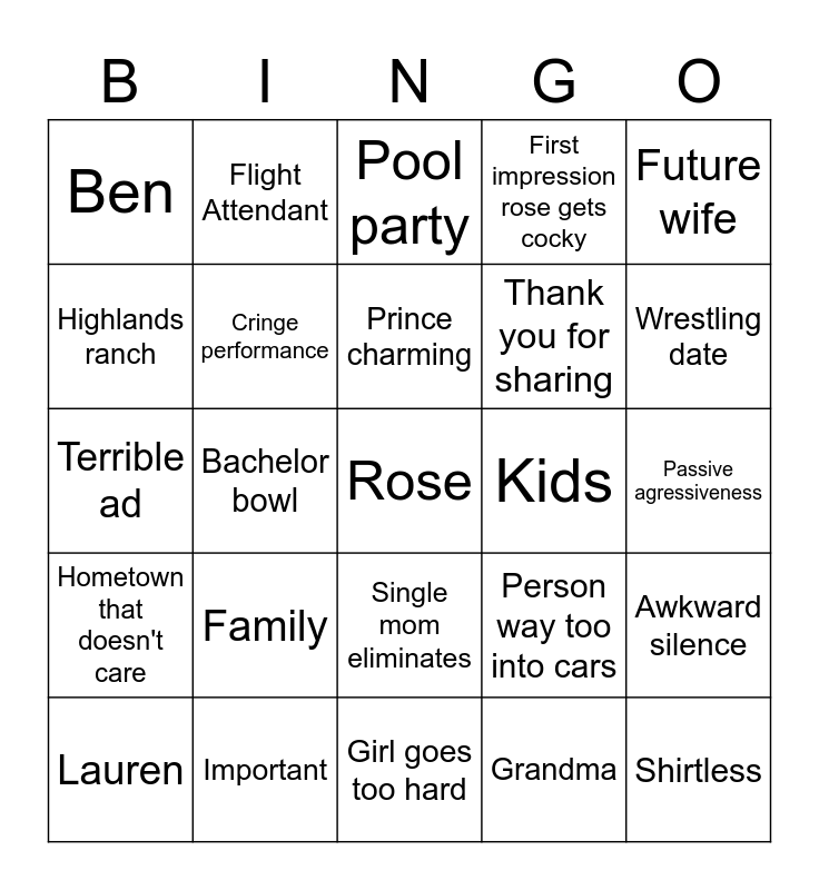 This bingo card has a free space and 24 words: Family, Important, Prince charming, Lauren, Future wife, Ben, Highlands ranch, Flight Attendant, Kids, Single mom eliminates, Thank you for sharing, Terrible ad, Person way too into cars, Awkward silence, Cringe performance, Grandma, Passive agressiveness, Pool party, Wrestling date, Bachelor bowl, Shirtless, Hometown that doesn't care, First impression rose gets cocky and Girl goes too hard.