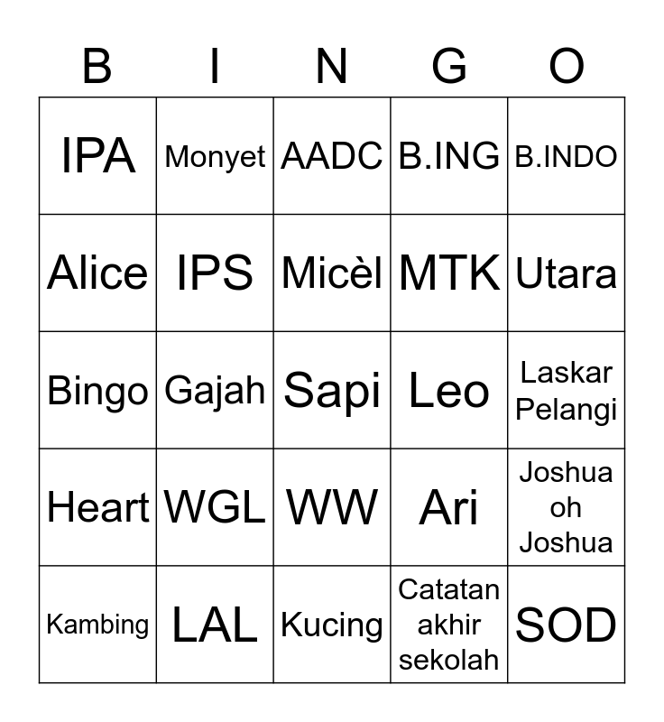This bingo card has 25 words: WGL, Kucing, Micèl, Kambing, B.INDO, IPA, Alice, Monyet, Leo, WW, MTK, Bingo, Ari, Joshua oh Joshua, IPS, SOD, Laskar Pelangi, AADC, Utara, Gajah, Sapi, LAL, Heart, B.ING and Catatan akhir sekolah.