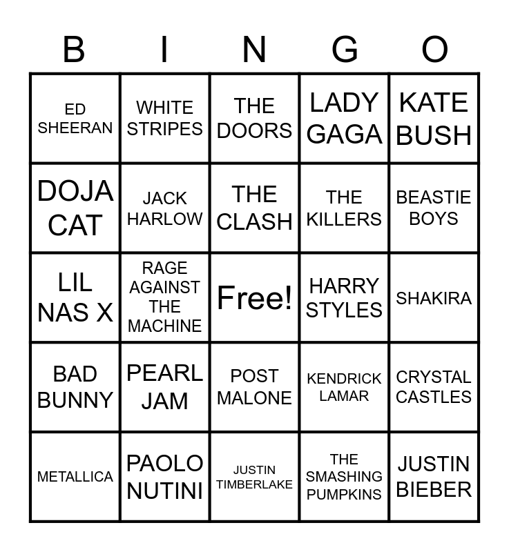 This bingo card has a free space and 56 words: ACDC, METALLICA, BILLIE EILISH, ED SHEERAN, JUSTIN TIMBERLAKE, MANESKIN, JACK HARLOW, TAYLOR SWIFT, THE KILLERS, OLIVIA RODRIGO, LADY GAGA, KANYE WEST, ROLLING STONES, DUA LIPA, SYSTEM OF A DOWN, EMINEM, KATE BUSH, RAGE AGAINST THE MACHINE, NWA, JUSTIN BIEBER, HARRY STYLES, NIRVANA, KENDRICK LAMAR, THE DOORS, HOUSE OF PAIN, THE CLASH, GREEN DAY, LIZZO, BEASTIE BOYS, RED HOT CHILI PEPPERS, BLINK-182, CYPRESS HILL, BTS, DRAKE, SHAKIRA, DOJA CAT, LIL NAS X, JOJI, BAD BUNNY, WHITE STRIPES, POST MALONE, ROYAL BLOOD, FOO FIGHTERS, BECK, WEEZER, PEARL JAM, PAOLO NUTINI, VAMPIRE WEEKEND, MACHINE GUN KELLY, TYLER, THE CREATOR, THE SMASHING PUMPKINS, QUEENS OF THE STONE AGE, THE BEACH BOYS, CHILDISH GAMBINO, CRYSTAL CASTLES and BOB MARLEY.