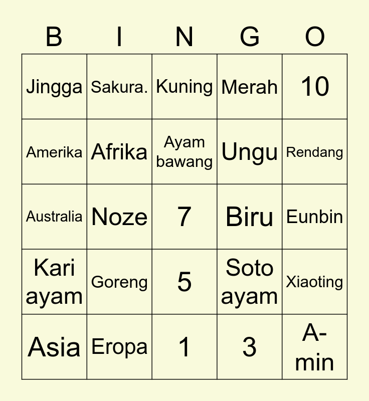 This bingo card has a free space and 24 words: Goreng, Eropa, Ayam bawang, Asia, 10, Jingga, Amerika, Sakura., Biru, 5, Ungu, Australia, Soto ayam, Xiaoting, Afrika, 3, Eunbin, Kuning, Rendang, Noze, A-min, Kari ayam, Merah and 1.