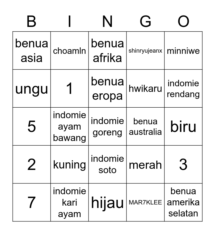 This bingo card has a free space and 24 words: kuning, indomie kari ayam, benua eropa, 7, minniwe, benua asia, ungu, choamln, benua australia, indomie soto, hwikaru, 5, merah, 3, 1, MAR7KLEE, biru, benua afrika, indomie rendang, indomie ayam bawang, benua amerika selatan, 2, shinryujeanx and hijau.