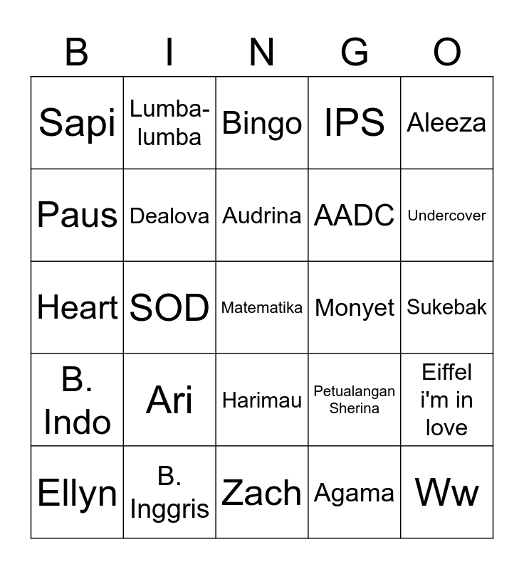 This bingo card has 25 words: Ari, Zach, Audrina, Ellyn, Aleeza, Sapi, Paus, Lumba-lumba, Monyet, Harimau, AADC, Heart, Petualangan Sherina, Eiffel i'm in love, Dealova, Ww, Sukebak, Bingo, Undercover, SOD, Matematika, B. Inggris, B. Indo, IPS and Agama.