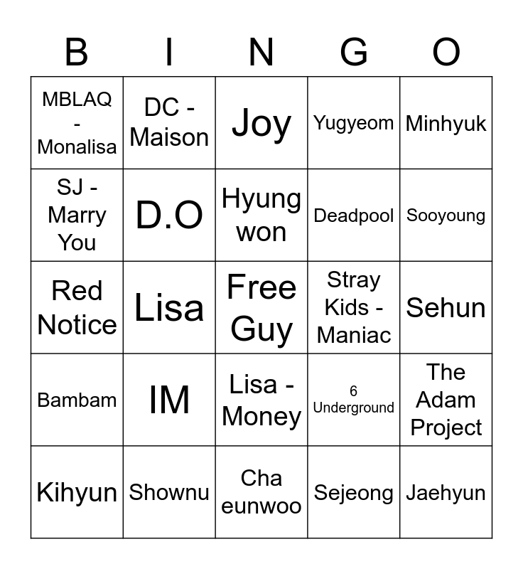 This bingo card has a free space and 24 words: IM, Shownu, Hyung won, Kihyun, Minhyuk, MBLAQ - Monalisa, SJ - Marry You, DC - Maison, Stray Kids - Maniac, Lisa - Money, Deadpool, Red Notice, 6 Underground, The Adam Project, D.O, Sejeong, Sehun, Joy, Sooyoung, Lisa, Jaehyun, Bambam, Yugyeom and Cha eunwoo.