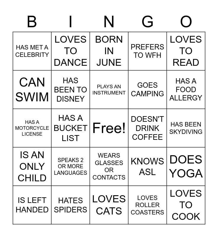 This bingo card has a free space and 24 words: SPEAKS 2 OR MORE LANGUAGES, HATES SPIDERS, PLAYS AN INSTRUMENT, IS LEFT HANDED, LOVES TO READ, HAS MET A CELEBRITY, CAN SWIM, LOVES TO DANCE, DOESN'T DRINK COFFEE, WEARS GLASSES OR CONTACTS, GOES CAMPING, HAS A MOTORCYCLE LICENSE, KNOWS ASL, DOES YOGA, HAS BEEN TO DISNEY, LOVES ROLLER COASTERS, HAS BEEN SKYDIVING, BORN IN JUNE, HAS A FOOD ALLERGY, HAS A BUCKET LIST, LOVES TO COOK, IS AN ONLY CHILD, PREFERS TO WFH and LOVES CATS.