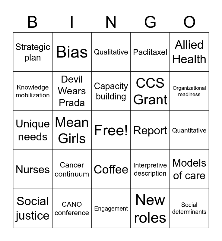 This bingo card has a free space and 29 words: Social justice, Equity, Mean Girls, Grouse Grind, Strategic plan, Qualitative, Devil Wears Prada, Cancer continuum, Report, CANO conference, Quantitative, Social determinants, Engagement, New roles, Organizational readiness, Brainstorm, Coffee, Nurses, Allied Health, Unique needs, Interpretive description, Branding, CCS Grant, Knowledge mobilization, Paclitaxel, Bias, Models of care, Capacity building and CNS.
