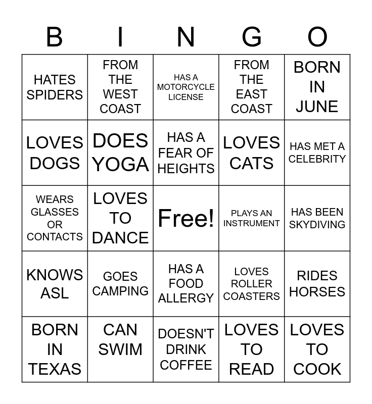 This bingo card has a free space and 29 words: BORN IN TEXAS, HAS BEEN TO DISNEY, LOVES TO DANCE, SPEAKS 2 OR MORE LANGUAGES, HATES SPIDERS, HAS A MOTORCYCLE LICENSE, DOES YOGA, GOES CAMPING, PLAYS AN INSTRUMENT, CAN SWIM, HAS BEEN SKYDIVING, LOVES TO COOK, DOESN'T DRINK COFFEE, LOVES TO READ, HAS MET A CELEBRITY, HAS A BUCKET LIST, HAS A FOOD ALLERGY, KNOWS ASL, BORN IN JUNE, WEARS GLASSES OR CONTACTS, LOVES ROLLER COASTERS, PREFERS TO WFH, LOVES CATS, LOVES DOGS, FROM THE EAST COAST, FROM THE WEST COAST, RIDES HORSES, HAS A FEAR OF HEIGHTS and BORN IN TEXAS.
