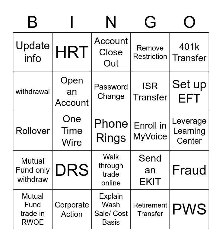 This bingo card has a free space and 24 words: DRS, Corporate Action, Password Change, Mutual Fund trade in RWOE, 401k Transfer, Update info, withdrawal, HRT, Enroll in MyVoice, Walk through trade online, ISR Transfer, Rollover, Send an EKIT, Fraud, Open an Account, Retirement Transfer, Leverage Learning Center, Account Close Out, Set up EFT, One Time Wire, PWS, Mutual Fund only withdraw, Remove Restriction and Explain Wash Sale/ Cost Basis.