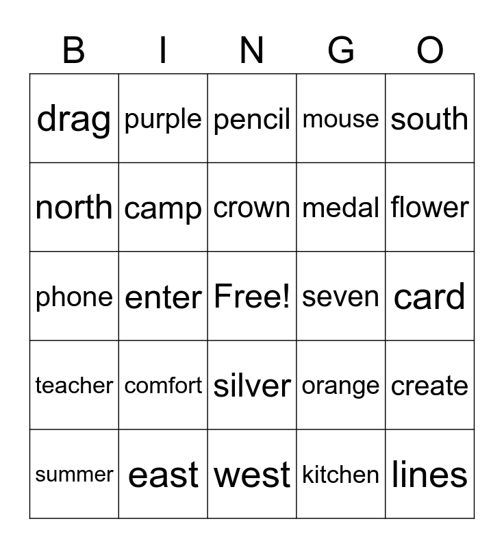 This bingo card has a free space and 29 words: summer, bottle, enter, glue, drag, pencil, camp, comfort, seven, east, card, lines, west, kitchen, flower, best, silver, teacher, south, phone, orange, staple, medal, north, mouse, purple, create, crown and color.