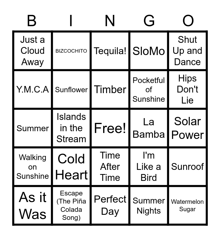 This bingo card has a free space and 58 words: Soak Up The Sun, Escape (The Piña Colada Song), Cool For The Summer, Walking on Sunshine, Summer Nights, Summertime Sadness, Sunflower, Party in The USA, Pocketful of Sunshine, Can't Get You Out of My Head, SloMo, The Tide is High, Wannabe, Music for a Sushi Restaurant, Don't Start Now, Just a Cloud Away, Watermelon Sugar, Shut Up and Dance, Waka Waka, Timber, La Bamba, Tequila!, As it Was, Sunroof, deja vu, Solar Power, Dancing Queen, I Wanna Dance With Somebody, Hips Don't Lie, Toxic, TikTok, Mamma Mia, Girls Just Want to Have Fun, Material Girl, Gimme! Gimme! Gimme!, Island in the Sun, What Time Is It?, Islands in the Stream, Summer, Cake By The Ocean, Cold Heart, Lovely Day, I'm Like a Bird, Coconut Tree, Man! I Feel Like A Woman!, Wake Me Up Before You Go-Go, Running Up That Hill, Time After Time, Perfect Day, We Are Family, Levitating, Rain On Me, Don't Stop Me Now, Woman, BIZCOCHITO, Oops... I Did It Again, Y.M.C.A and Treat People With Kindness.