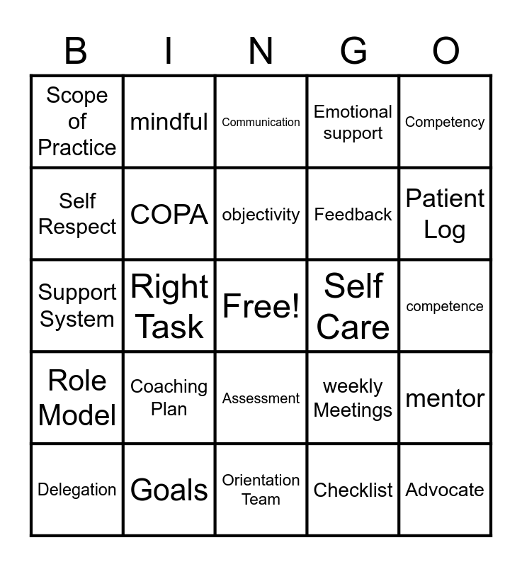 This bingo card has a free space and 29 words: Delegation, Accountability, Right Task, Right Circumstance, Scope of Practice, Communication, COPA, Coaching Plan, Self Care, Goals, competence, Advocate, Orientation Team, Checklist, Patient Log, Validation, Assessment, Role Model, Competency, Support System, weekly Meetings, Goals, Feedback, Self Respect, Emotional support, mindful, mentor, objectivity and self awareness.