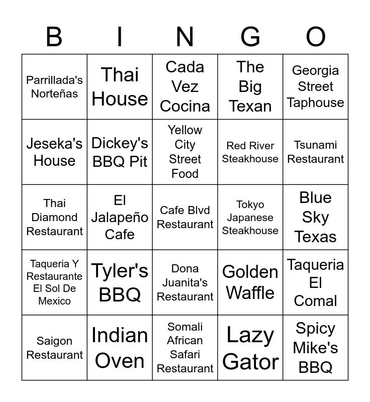 This bingo card has a free space and 24 words: Tyler's BBQ, Indian Oven, Yellow City Street Food, Saigon Restaurant, Georgia Street Taphouse, Parrillada's Norteñas, Jeseka's House, Thai House, Tokyo Japanese Steakhouse, Dona Juanita's Restaurant, Red River Steakhouse, Thai Diamond Restaurant, Golden Waffle, Taqueria El Comal, Dickey's BBQ Pit, Lazy Gator, Blue Sky Texas, Cada Vez Cocina, Tsunami Restaurant, El Jalapeño Cafe, Spicy Mike's BBQ, Taqueria Y Restaurante El Sol De Mexico, The Big Texan and Somali African Safari Restaurant.