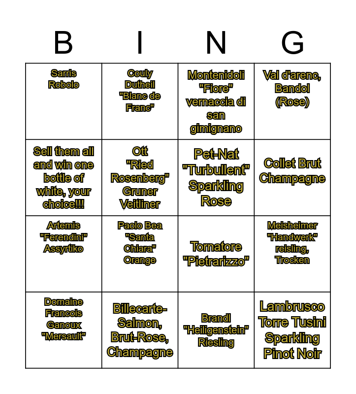 This bingo card has 16 words: Billecarte-Salmon, Brut-Rose, Champagne, Meisheimer "Handwerk" reisling, Trocken, Montenidoli "Fiore" vernaccia di san gimignano, Sarris Robolo, Artemis "Ferendini" Assyrtiko, Couly Dutheil "Blanc de Franc", Tornatore "Pietrarizzo", Brandl "Heiligenstein" Riesling, Sell them all and win one bottle of white, your choice!!!, Ott "Ried Rosenberg" Gruner Veitliner, Domaine Francois Ganoux "Mersault", Val d'arenc, Bandol (Rose), Paolo Bea "Santa Chiara" Orange, Collet Brut Champagne, Pet-Nat "Turbullent" Sparkling Rose and Lambrusco Torre Tusini Sparkling Pinot Noir.