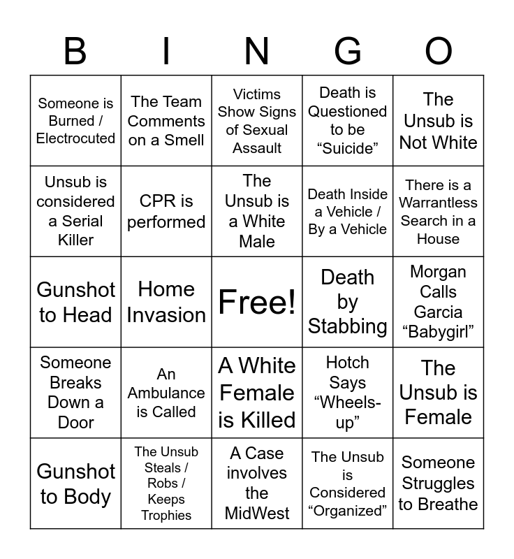 This bingo card has a free space and 32 words: The Unsub is Considered “Organized”, Kidnapping / Abduction, Home Invasion, Someone is Seen Eating / Drinking, Someone Breaks Down a Door, CPR is performed, The Unsub is Not White, The Unsub is Female, The Team Comments on a Smell, Reid States a Statistic, The Unsub is a White Male, Victims Show Signs of Sexual Assault, The Unsub is a Teenager, There are 3 or more Unsubs, Death by Stabbing, Death by Slashing, Gunshot to Body, Gunshot to Head, A White Female is Killed, An Ambulance is Called, Hotch Says “Wheels-up”, The Unsub Shows “Signs of Remorse”, Morgan Calls Garcia “Babygirl”, The Unsub Steals / Robs / Keeps Trophies, Someone Struggles to Breathe, Death is Questioned to be “Suicide”, Death Inside a Vehicle / By a Vehicle, Unsub is considered a Serial Killer, Someone is Burned / Electrocuted, A Case involves the MidWest, The Unsub is considered a “Psychopath” or “Sociopath” and There is a Warrantless Search in a House.