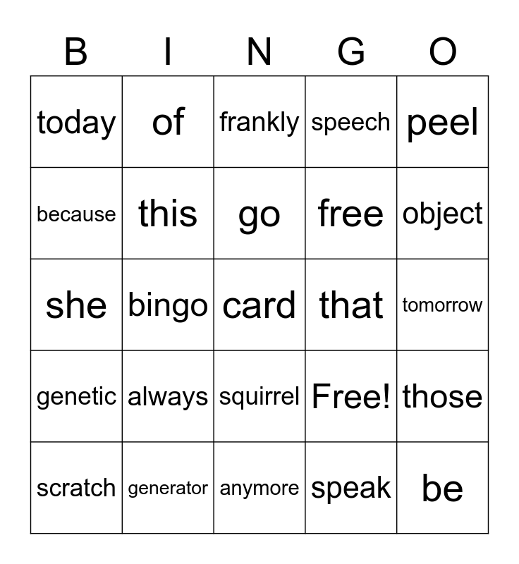This bingo card has 25 words: always, anymore, go, scratch, peel, today, because, of, that, squirrel, free, she, Free!, those, this, be, tomorrow, frankly, object, bingo, card, generator, genetic, speech and speak.
