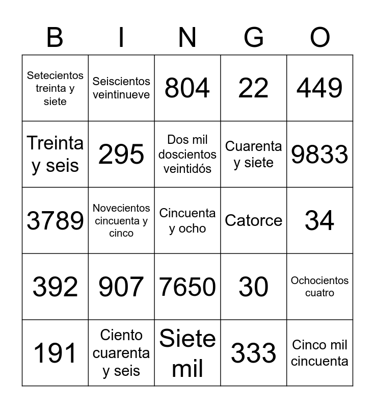 This bingo card has a free space and 34 words: Ochocientos cuarenta y tres, 333, 134, Ocho mil cuatro, 392, 295, 449, 191, Seiscientos veintinueve, 27, Dos mil doscientos veintidós, 804, Dos mil, Cinco mil trescientos noventa y nueve, Catorce, 9833, Ciento cuarenta y seis, 3789, 907, 30, 7650, Quinientos ochenta y dos, Setecientos treinta y siete, 34, Siete mil, Cinco mil cincuenta, 22, 893, Cuarenta y siete, Treinta y seis, 39, Novecientos cincuenta y cinco, Ochocientos cuatro and 108.