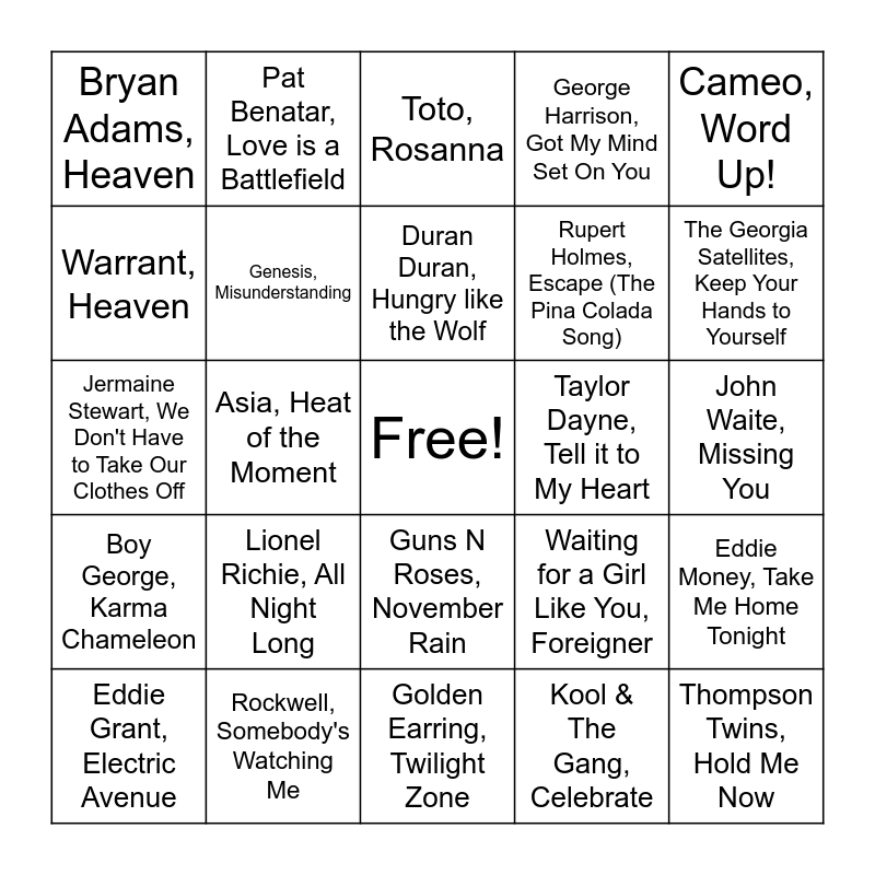 This bingo card has a free space and 97 words: .38 Special, Hold On Loosely, A Flock of Seagulls, I Ran, Aerosmith, Ragdoll, Asia, Heat of the Moment, B-52's, Love Shack, Baltimora, Tarzan Boy, Bananarama, Venus, Beastie Boys, No Sleep Til Brooklyn, Billy Joel, It's Still Rock and Roll to Me, Blondie, Call Me, Bobby Brown, My Prerogative, Bon Jovi, You Give Love a Bad Name, Bonnie Tyler, Holding Out for a Hero, Boy George, Karma Chameleon, Bruce Springsteen, Dancing in the Dark, Bryan Adams, Heaven, Cameo, Word Up!, Chicago, You're the Inspiration, Corey Hart, Sunglasses at Night, Culture Club, Do You Really Want to Hurt Me, Cyndi Lauper, She Bop, Debarge, Rhythm of the Night, Dionne and Friends, That's What Friends are For, Dolly Parton, 9 To 5, Donna Summer, She Works Hard for the Money, Duran Duran, Hungry like the Wolf, Eddie Grant, Electric Avenue, Eddie Money, Take Me Home Tonight, Elton John, I Guess That's Why They Call It The Blues, Fine Young Cannibals, She Drives Me Crazy, Genesis, Misunderstanding, George Harrison, Got My Mind Set On You, Glenn Frey, The Heat is On, Gloria Estefan/ Miami Sound Machine, Rhythm is Gonna Get You, Golden Earring, Twilight Zone, Guns N Roses, November Rain, Hall & Oates, Kiss on my List, Heart, Alone, J Geils Band, Centerfold, Jermaine Stewart, We Don't Have to Take Our Clothes Off, John Cougar Mellencamp, Hurts So Good, John Waite, Missing You, Kim Wilde, Kids in America, Kool & The Gang, Celebrate, Lionel Richie, All Night Long, Lipps Inc., Funkytown, Loverboy, Working for the Weekend, Madness, Our House, Madonna, Lucky Star, Men at Work, Down Under, Men Without Hats, The Safety Dance, Michael Sembello, Maniac, Milli Vanilli, Blame It on the Rain, Mister Mister, Broken Wings, Naked Eyes, Always Something There to Remind Me, New Kids on the Block, You Got It (The Right Stuff), Night Ranger, Sister Christian, Pat Benatar, Love is a Battlefield, Paul Young, Everytime You Go Away, Peter Gabriel, Solsbury Hill, Phil Collins, In the Air Tonight, Pink Floyd, Another Brick in the Wall, pt. II, Poison, Nothin' But a Good Time, Prince, Raspberry Beret, Queen, Another One Bites the Dust, R.E.M., It's the End of the World as we Know It, REO Speedwagon, Take it on the Run, Rick Astley, Never Gonna Give You Up, Rick Springfield, Jessie's Girl, Rockwell, Somebody's Watching Me, Rupert Holmes, Escape (The Pina Colada Song), Sade, Smooth Operator, Skid Row, 18 and Life, Stacey Q, Two of Hearts, Starship, Nothing's Gonna Stop Us Now, Steve Perry, Oh Sherrie, Steve Winwood, Higher Love, Stevie Wonder, I Just Called to Say I Love You, Taylor Dayne, Tell it to My Heart, Tears for Fears, Everybody Wants to Rule the World, The Cure, Lovesong, The Georgia Satellites, Keep Your Hands to Yourself, The Go-Gos, Our Lips are Sealed, The Human League, Don't You Want Me, The Police, Don't Stand So Close to Me, The Romantics, Talking in Your Sleep, Thompson Twins, Hold Me Now, Tiffany, I Think We're Alone Now, Tommy Tutone, 867-5309 (Jenny), Tone Loc, Wild Thing, Toto, Rosanna, Tracy Chapman, Fast Car, U2, Where The Streets Have No Name, Waiting for a Girl Like You, Foreigner, Warrant, Heaven, Wham!, Careless Whisper and Whitney Houston, How Will I Know.