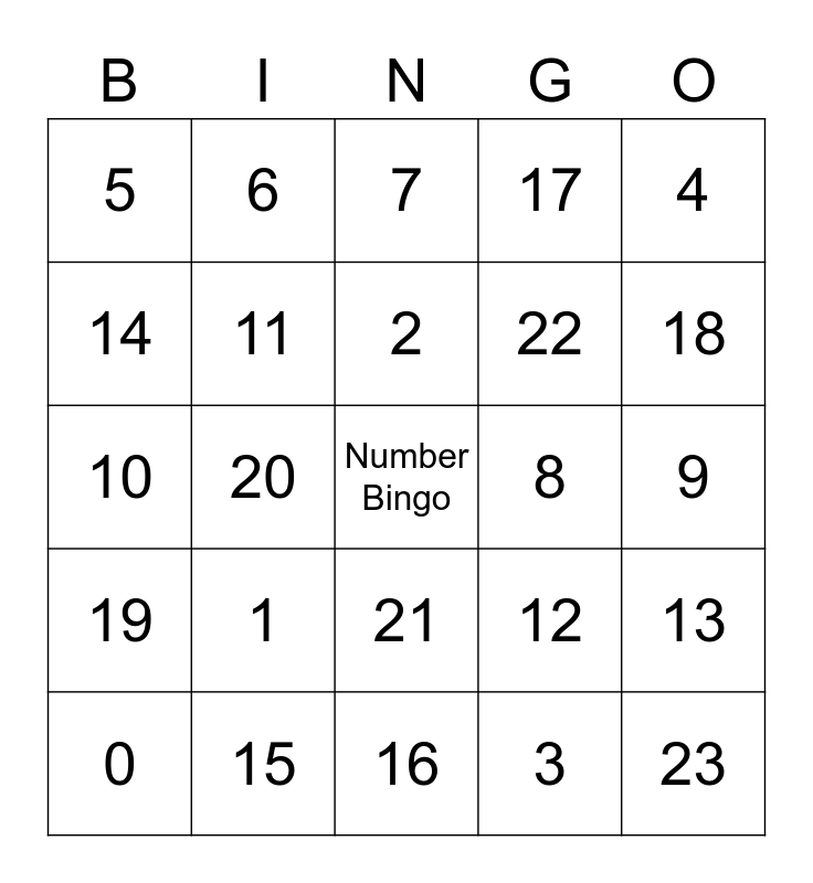 This bingo card has a free space and 24 words: 0, 1, 2, 3, 4, 5, 6, 7, 8, 9, 10, 11, 12, 13, 14, 15, 16, 17, 18, 19, 20, 21, 22 and 23.