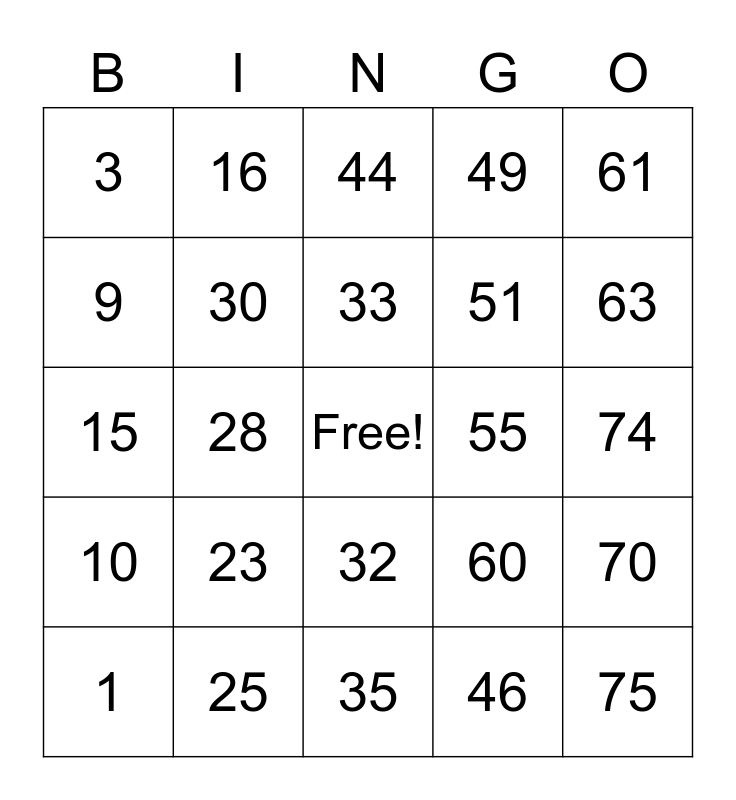 This bingo card has a free space and 24 words: 1, 23, 33, 46, 61, 3, 16, 44, 55, 74, 15, 30, 60, 70, 9, 25, 35, 49, 63, 10, 28, 32, 51 and 75.