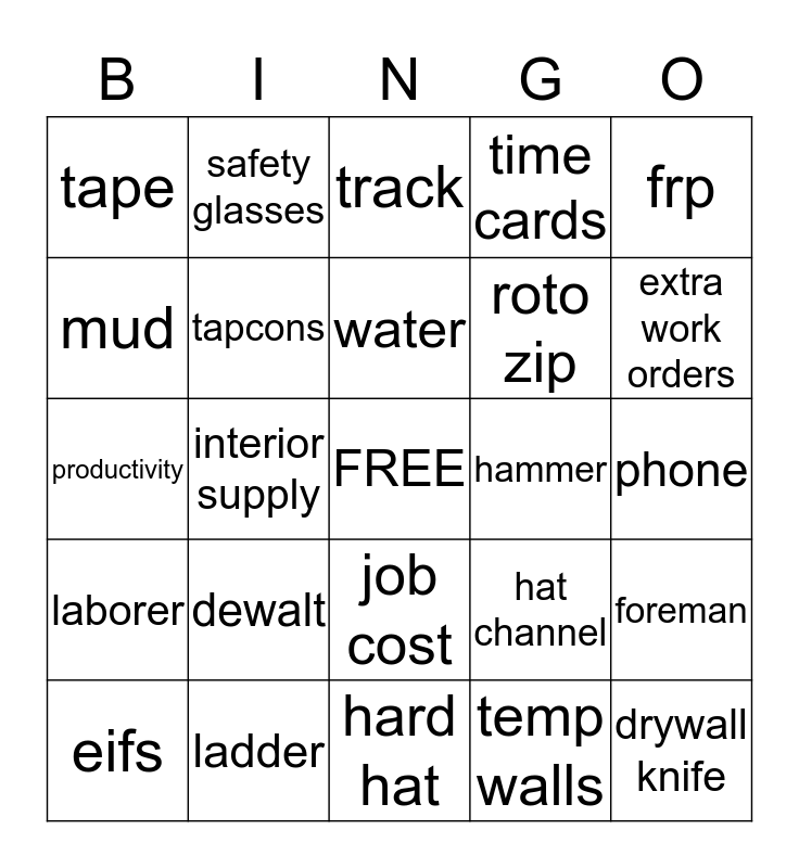 This bingo card has a free space and 24 words: dewalt, ladder, water, eifs, frp, tape, mud, safety glasses, hammer, job cost, roto zip, productivity, hat channel, foreman, tapcons, temp walls, phone, track, extra work orders, interior supply, drywall knife, laborer, time cards and hard hat.