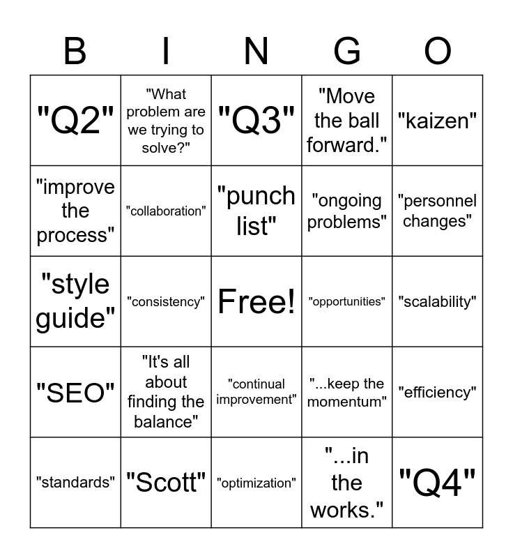 This bingo card has a free space and 24 words: "It's all about finding the balance", "Scott", "punch list", "standards", "kaizen", "Q2", "improve the process", "What problem are we trying to solve?", "opportunities", "continual improvement", "ongoing problems", "style guide", "...keep the momentum", "efficiency", "collaboration", "...in the works.", "scalability", "Q3", "personnel changes", "consistency", "Q4", "SEO", "Move the ball forward." and "optimization".
