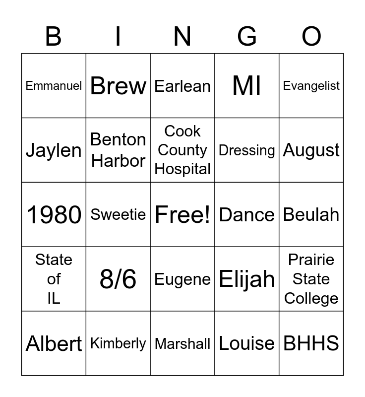 This bingo card has a free space and 44 words: Star, 8/6, 1962, Louise, Vanessa, Clarksdale, Benton Harbor, MS, MI, BHHS, Emmanuel, Kimberly, Elijah, Beulah, Vivian, Leo, Marshall, Dance, Skate, 1980, Brew, Eugene, Purple, Evangelist, 7th, JSU, Cook County Hospital, Victory, Prairie State College, Albert, Rommey, Earlean, Marcella, Dennis, State of IL, GSU, Houston TX, 60, August, Jaylen, Sweetie, Oatmeal, Dressing and Minister.