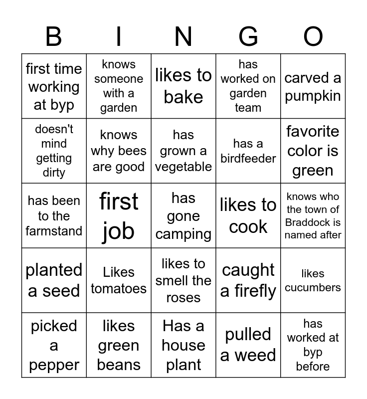 This bingo card has 25 words: Likes tomatoes, Has a house plant, has grown a vegetable, picked a pepper, carved a pumpkin, first time working at byp, doesn't mind getting dirty, knows someone with a garden, likes to cook, likes to smell the roses, has a birdfeeder, has been to the farmstand, caught a firefly, likes cucumbers, knows why bees are good, has worked at byp before, knows who the town of Braddock is named after, likes to bake, favorite color is green, first job, has gone camping, likes green beans, planted a seed, has worked on garden team and pulled a weed.