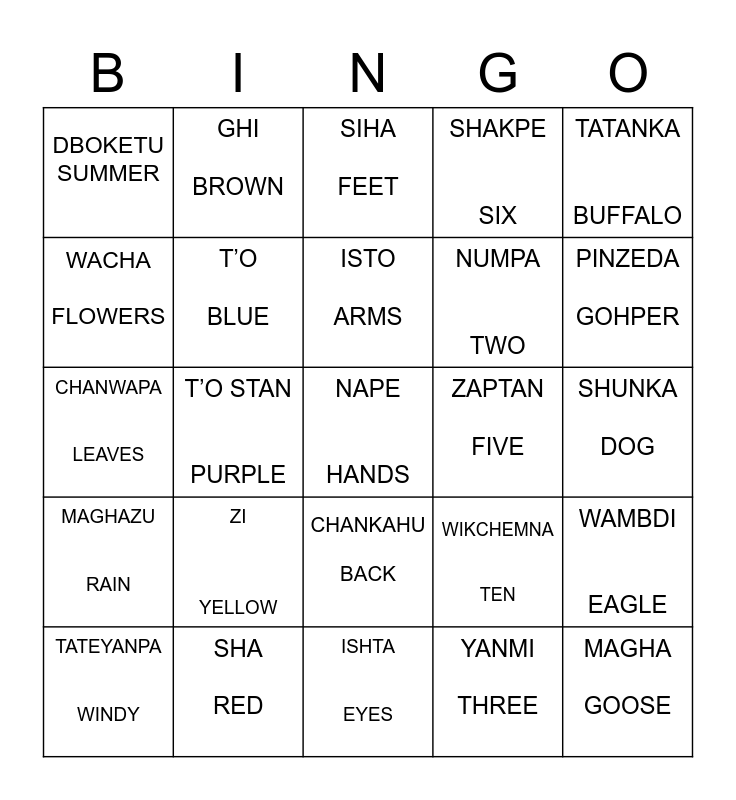 This bingo card has 50 words: PTANYETU AUTUMN, SHA RED, PA HEAD, WANCHA ONE, SHUNKA DOG, WANIYETU WINTER, GHI BROWN, TACHAN BODY, NUMPA TWO, PUSIDA CAT, DBOKETU SUMMER, T’O BLUE, NAPE HANDS, YANMI THREE, SHUNKA WAKAN HORSE, WETU SPRING, T’O STAN PURPLE, ISTO ARMS, TOPA FOUR, TATANKA BUFFALO, CHANWAPA LEAVES, KHOTA GREY, SIHA FEET, ZAPTAN FIVE, TA MOOSE, MAGHAZU RAIN, ZI YELLOW, PAHIN HAIR, SHAKPE SIX, WAMBDI EAGLE, WA SNOW, PEZI T’O GREEN, POGHE NOSE, SHAKOWIN SEVEN, ZITKADA BIRD, TATEYANPA WINDY, SAPA BLACK, ISHTA EYES, SHAHDOGHAN EIGHT, PINZEDA GOHPER, MAHPIYA CLOUDS, SKA WHITE, CHANKAHU BACK, NAPCHUNWINKA NINE, MAGHA GOOSE, WACHA FLOWERS, GHI GHI ORANGE, HI TEETH, WIKCHEMNA TEN and WICHA RACCOON.