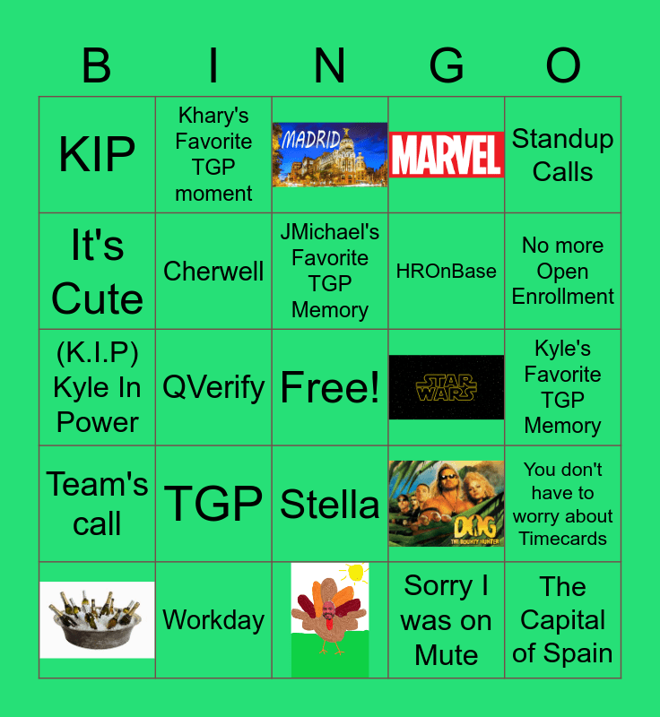 This bingo card has 6 images, a free space and 18 words: TGP, Workday, JMichael's Favorite TGP Memory, Standup Calls, KIP, It's Cute, Khary's Favorite TGP moment, Stella, HROnBase, (K.I.P) Kyle In Power, You don't have to worry about Timecards, Cherwell, Sorry I was on Mute, Kyle's Favorite TGP Memory, No more Open Enrollment, QVerify, The Capital of Spain and Team's call.