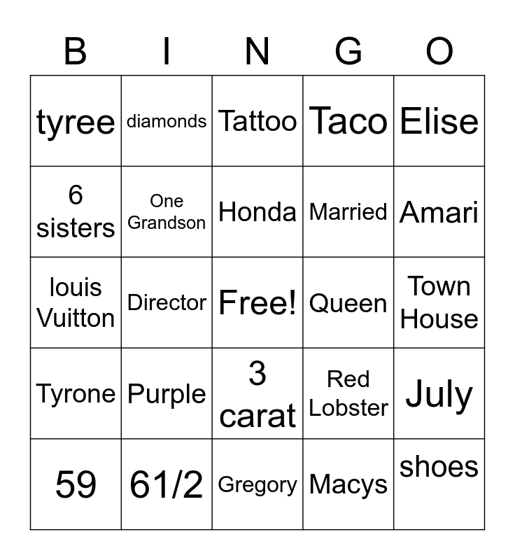 This bingo card has a free space and 24 words: Purple, 61/2, Honda, 59, Elise, tyree, 6 sisters, diamonds, Queen, 3 carat, Married, louis Vuitton, Red Lobster, July, One Grandson, Macys, Town House, Tattoo, Amari, Director, shoes, Tyrone, Taco and Gregory.