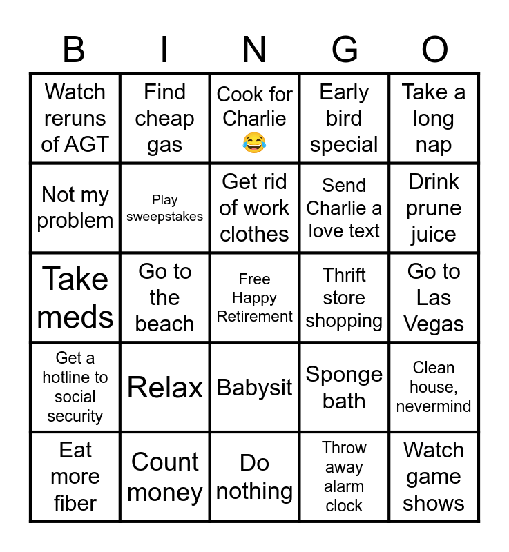 This bingo card has a free space and 24 words: Relax, Count money, Get rid of work clothes, Eat more fiber, Take a long nap, Watch reruns of AGT, Not my problem, Find cheap gas, Thrift store shopping, Babysit, Send Charlie a love text, Take meds, Sponge bath, Clean house, nevermind, Play sweepstakes, Throw away alarm clock, Go to Las Vegas, Cook for Charlie 😂, Drink prune juice, Go to the beach, Watch game shows, Get a hotline to social security, Early bird special and Do nothing.