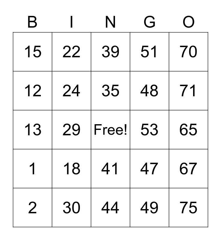 This bingo card has a free space and 24 words: 2, 18, 35, 49, 70, 15, 22, 39, 53, 65, 13, 24, 47, 67, 12, 30, 44, 51, 71, 1, 29, 41, 48 and 75.