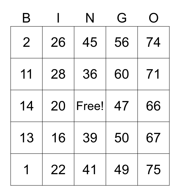 This bingo card has a free space and 24 words: 1, 16, 36, 49, 74, 2, 26, 45, 47, 66, 14, 28, 50, 67, 11, 22, 41, 56, 71, 13, 20, 39, 60 and 75.
