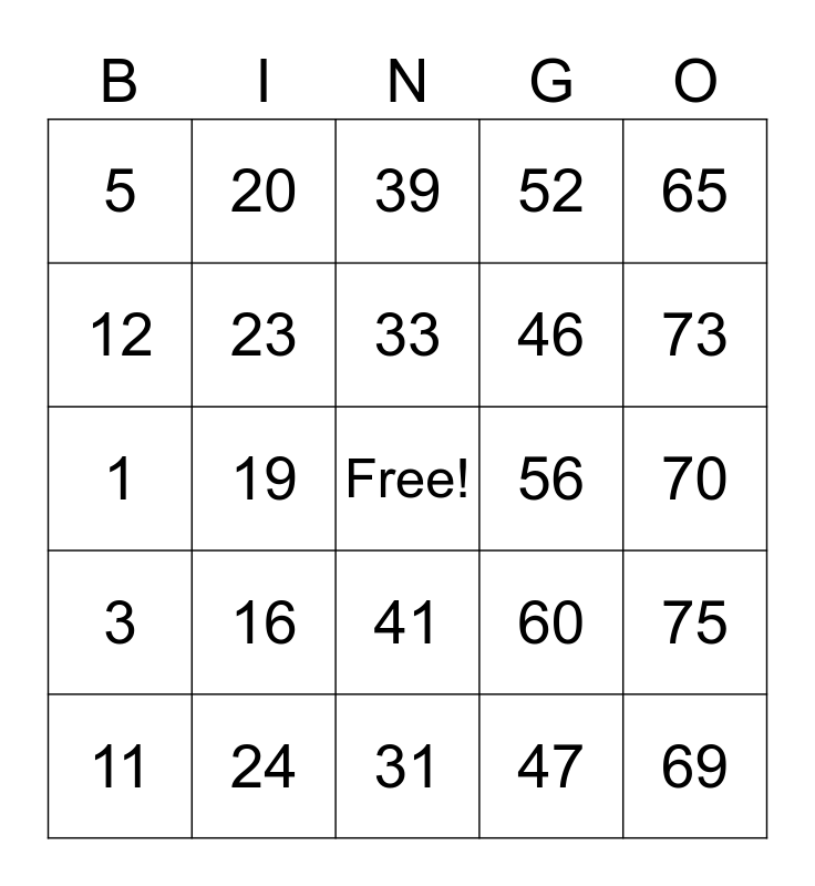This bingo card has a free space and 24 words: 11, 16, 33, 47, 65, 5, 20, 39, 56, 70, 1, 23, 60, 75, 12, 24, 31, 52, 73, 3, 19, 41, 46 and 69.