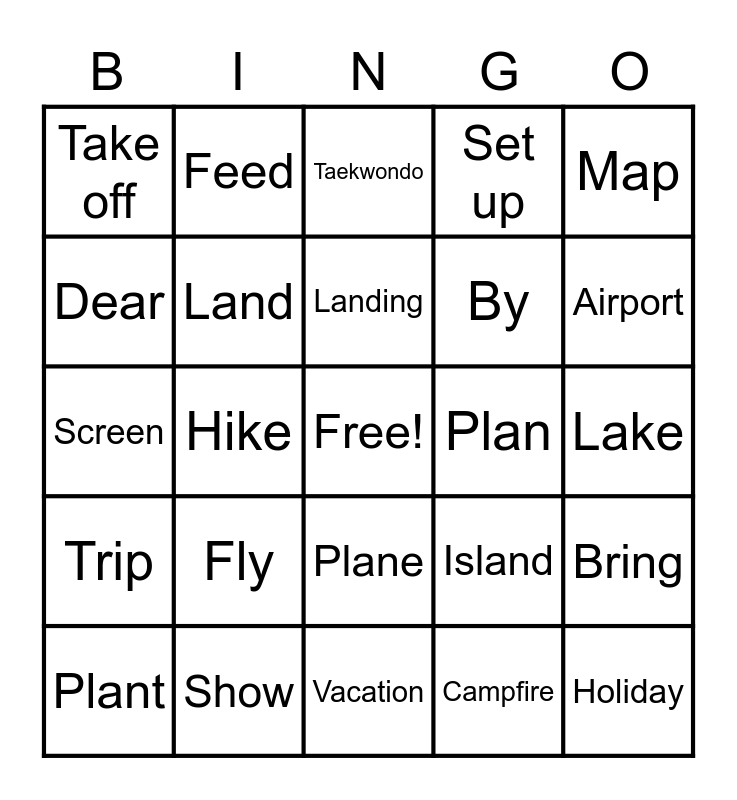 This bingo card has a free space and 28 words: Bring, Boat, By, Campfire, Dear, Taekwondo, Feed, Trip, Plan, Plant, Screen, Set up, Show, Vacation, Airport, Check-in, Fly, Land, Landing, Plane, Take off, Cruise, Holiday, Hike, Lake, Island, Map and Rest.