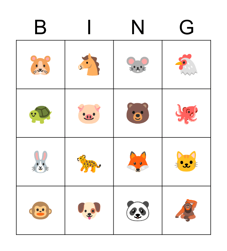 This bingo card has 16 words: 🐶, 🐱, 🐭, 🐹, 🐰, 🐴, 🦊, 🐼, 🐢, 🐷, 🐵, 🐔, 🐆, 🐙, 🐻 and 🦧.