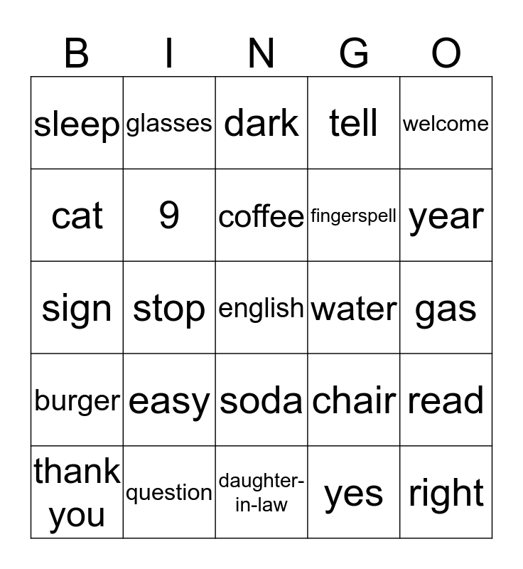 This bingo card has a free space and 24 words: easy, question, coffee, thank you, welcome, sleep, cat, glasses, water, soda, fingerspell, sign, chair, read, 9, yes, gas, dark, year, stop, right, burger, tell and daughter-in-law.