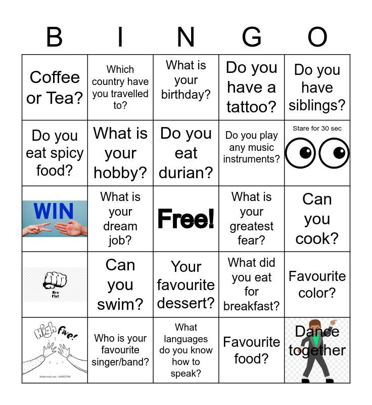 This bingo card has 5 images, a free space and 21 words: Can you swim?, Who is your favourite singer/band?, Do you eat durian?, Do you have siblings?, Coffee or Tea?, Do you eat spicy food?, Which country have you travelled to?, What is your greatest fear?, Your favourite dessert?, Do you play any music instruments?, What did you eat for breakfast?, Favourite color?, What is your hobby?, Favourite food?, Can you cook?, What is your birthday?, Stare for 30 sec, What is your dream job?, Dance together, Do you have a tattoo? and What languages do you know how to speak?.