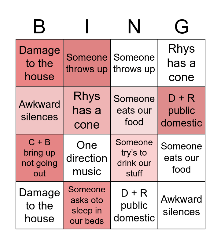 ⚠ This card has duplicate items: D + R public domestic (2), Awkward silences (2), Damage to the house (2), Rhys has a cone (2), Someone throws up (2), Someone asks oto sleep in our beds (2), Someone eats our food (2), One direction music (2)