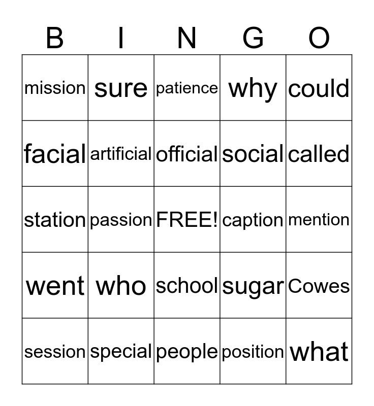 This bingo card has a free space and 24 words: who, special, official, session, could, mission, facial, sure, caption, school, social, station, sugar, Cowes, artificial, position, mention, patience, called, passion, what, went, why and people.