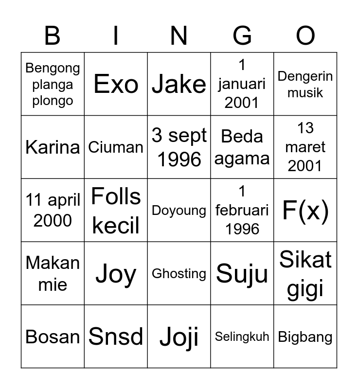 This bingo card has a free space and 24 words: Joy, Snsd, 3 sept 1996, Bosan, Dengerin musik, Bengong planga plongo, Karina, Exo, 1 februari 1996, Ghosting, Beda agama, 11 april 2000, Suju, Sikat gigi, Ciuman, Selingkuh, F(x), Jake, 13 maret 2001, Folls kecil, Bigbang, Makan mie, 1 januari 2001 and Joji.