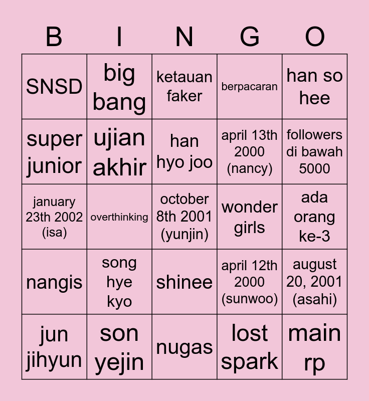 This bingo card has a free space and 24 words: song hye kyo, son yejin, han hyo joo, jun jihyun, han so hee, SNSD, super junior, big bang, wonder girls, shinee, april 13th 2000 (nancy), january 23th 2002 (isa), april 12th 2000 (sunwoo), august 20, 2001 (asahi), ujian akhir, lost spark, ada orang ke-3, ketauan faker, followers di bawah 5000, overthinking, main rp, nangis, berpacaran and nugas.