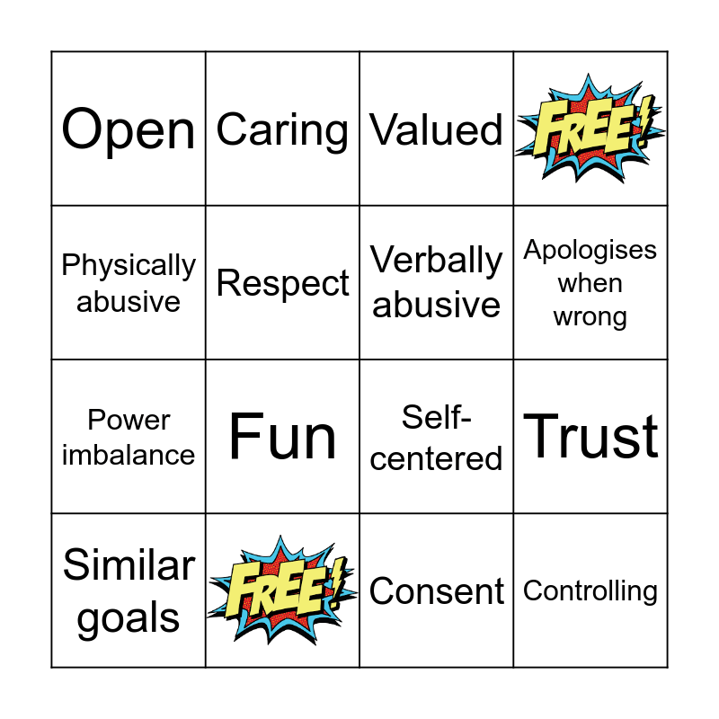 This bingo card has 2 images and 14 words: Trust, Valued, Open, Power imbalance, Caring, Self-centered, Consent, Physically abusive, Respect, Similar goals, Fun, Apologises when wrong, Verbally abusive and Controlling.