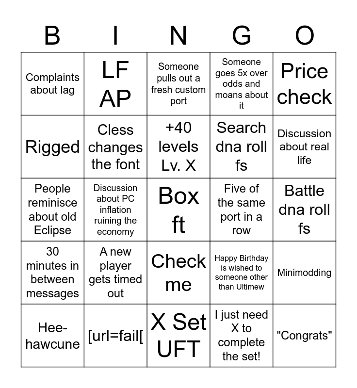This bingo card has a free space and 29 words: Hee-hawcune, Ban Baddy, Discussion about PC inflation ruining the economy, LF rares, Complaints about lag, Someone pulls out a fresh custom port, Cless changes the font, A new player gets timed out, Five of the same port in a row, [url=fail[, Battle dna roll fs, "Congrats", X Set UFT, I just need X to complete the set!, Discussion about real life, Bush, Check me, 30 minutes in between messages, Price check, People reminisce about old Eclipse, Happy Birthday is wished to someone other than Ultimew, Someone advertises their raffle, Search dna roll fs, Rigged, Someone goes 5x over odds and moans about it, LF AP, Minimodding, +40 levels Lv. X and "How does seillib trading day work?".
